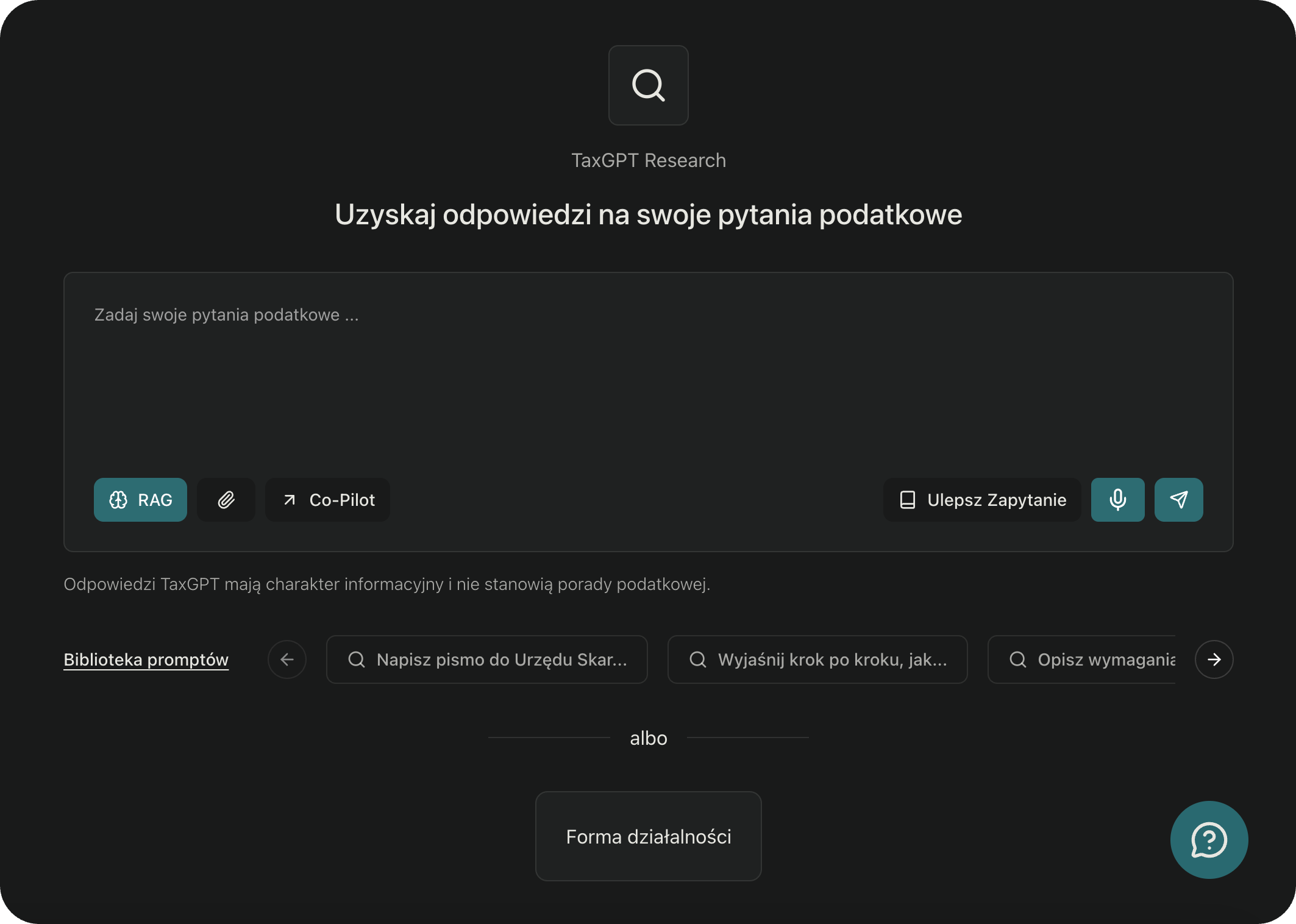 Fiskalna.ai oferuje wiele zaawansowanych funkcji. Zacznij od poznania naszego inteligentnego asystenta podatkowego. Generator interpretacji podatkowych